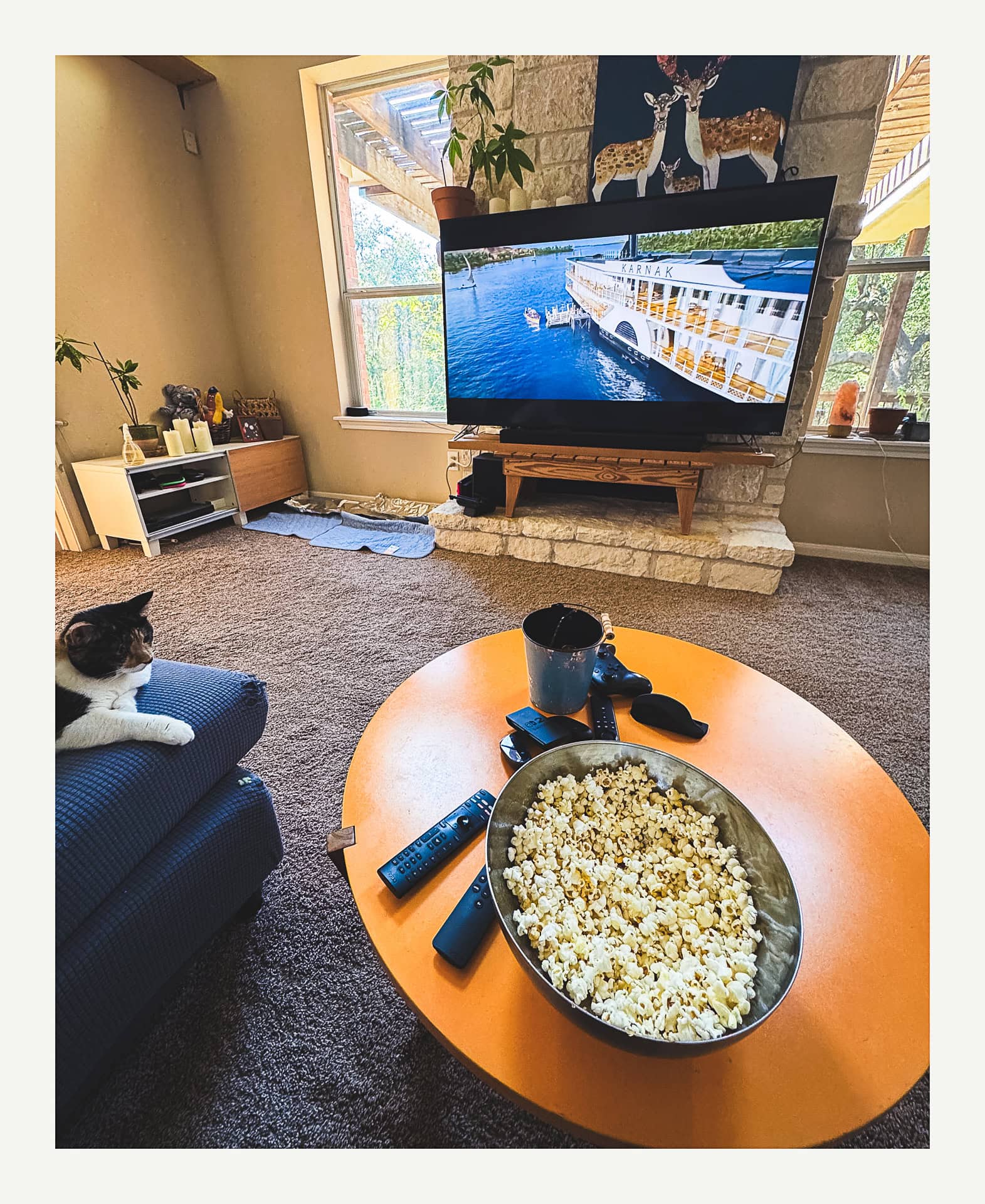 I made myself a big bowl of popcorn and settled in to watch Death on the Nile. Since we’re heading to Egypt soon, I figured it’d be fun to revisit the scenery. About ten minutes in, I remembered… oh right, this movie isn’t that great. So I snapped a quick photo for the moment, then happily switched over to my Chinese wuxia drama instead!