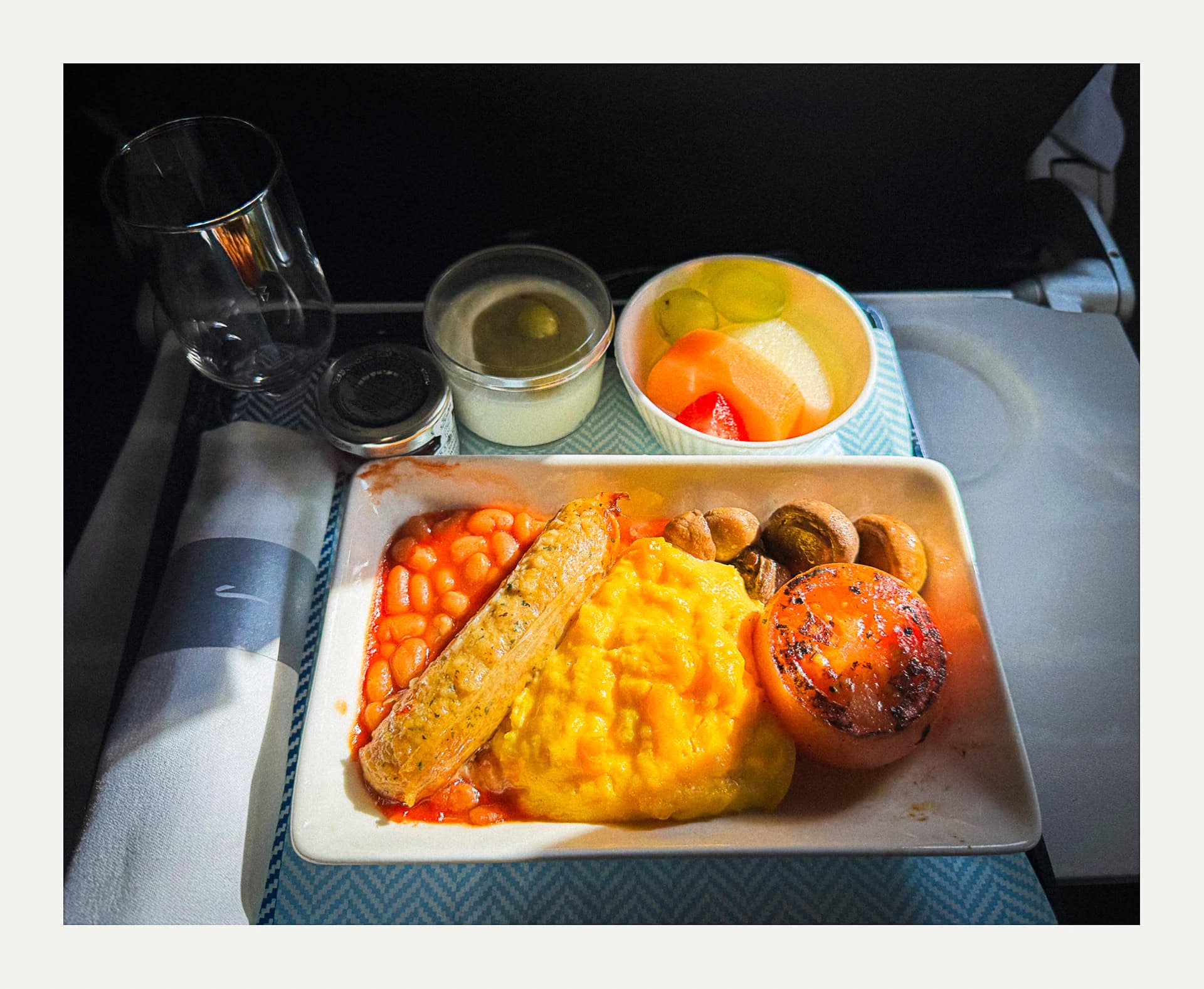 I was pleasantly surprised to discover that our seats were in front of the curtain, and we enjoyed a coffee or tea service followed by a Full English breakfast. I was not very hungry, but I had to try it. It was actually pretty good.
