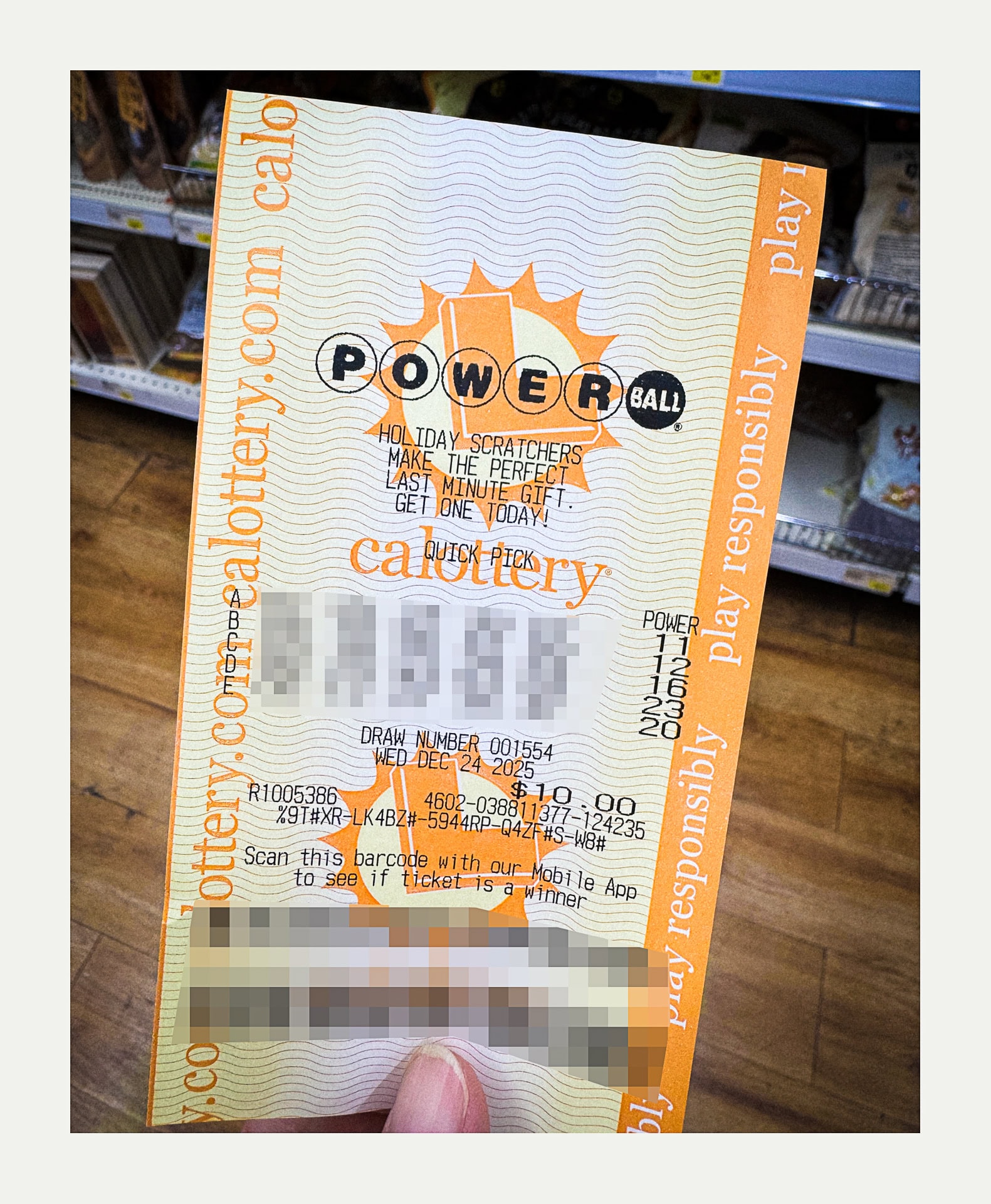I bought a Powerball ticket today, hoping I might win a share of the massive 1.6 billion dollar jackpot. Sadly, luck was not on my side this time. I lost. Oh well.