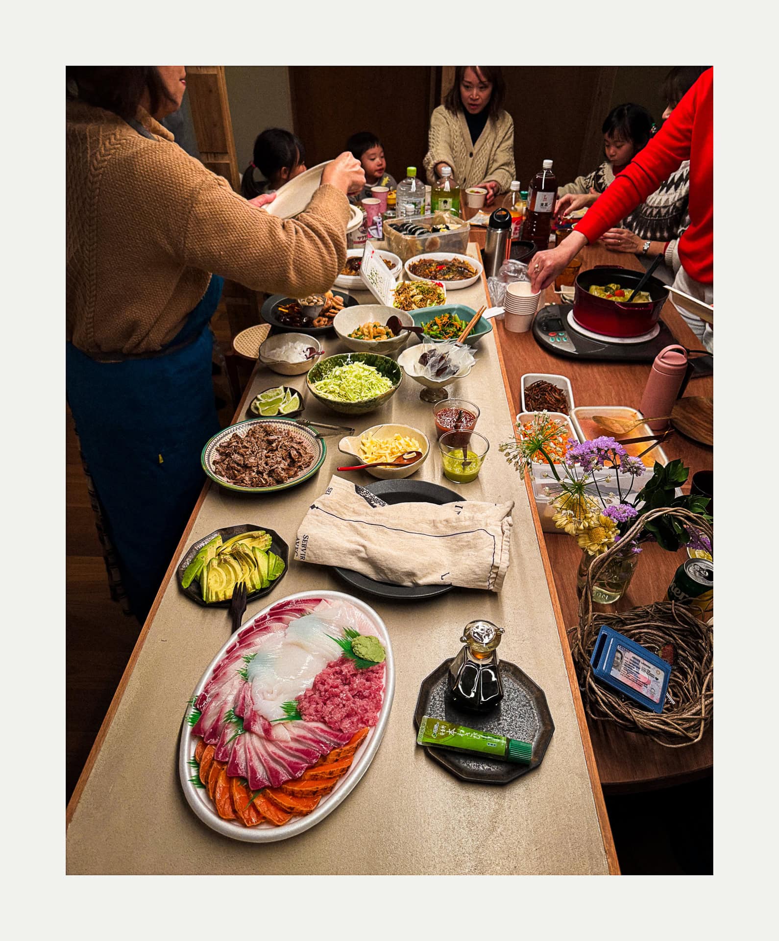 I made carnitas tacos, complete with fixings I hauled over from Texas like precious cargo. Totally worth it. Our guests showed up with an incredible spread of sashimi, sushi, okonomiyaki, yakisoba, tamagoyaki, plus plenty of beer and saké. It turned into the most delicious cultural mashup feast you can imagine 🌮🍣