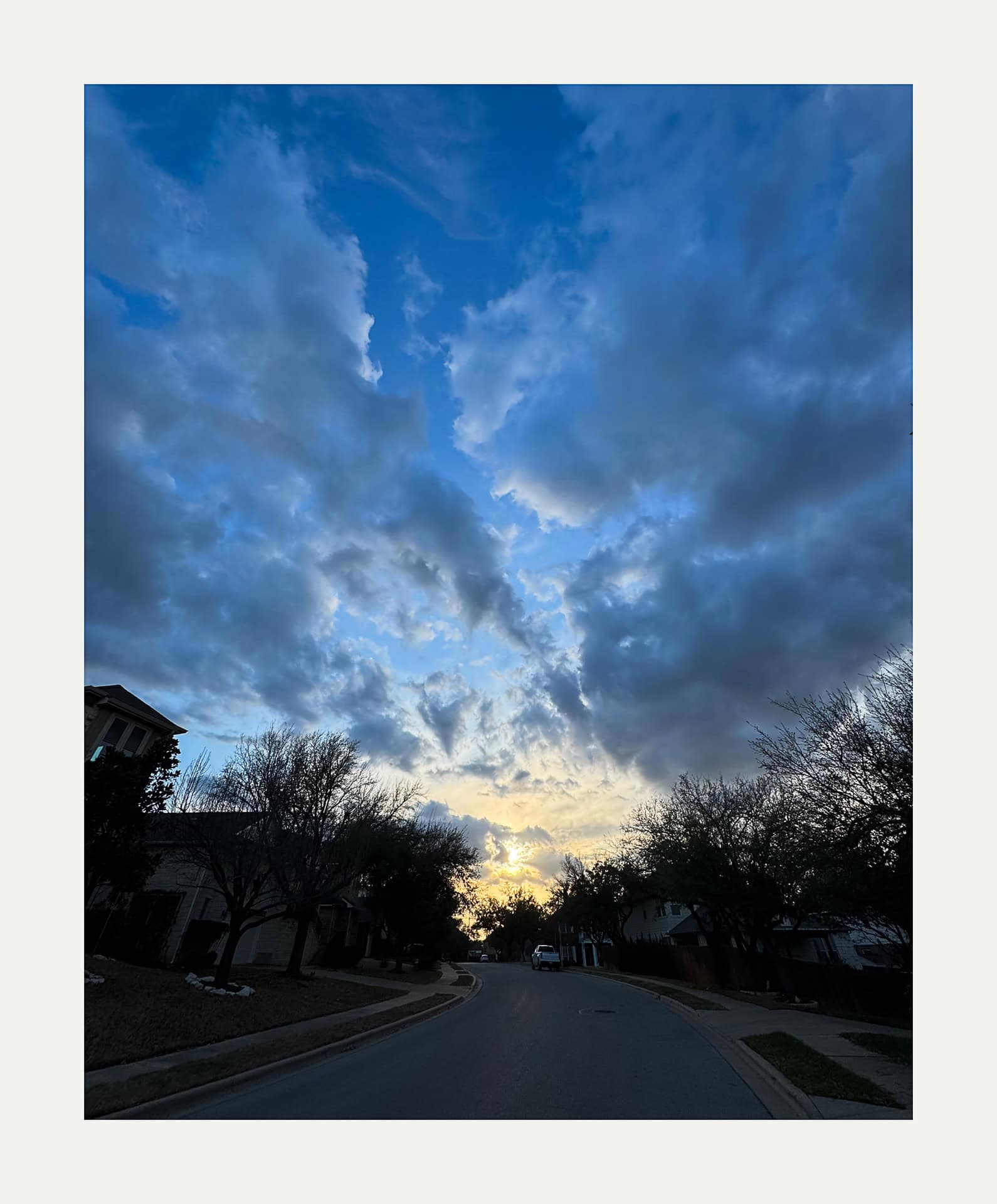 Sunset Clouds Thursday, March 5th, 2026Saturday, March 14th, 2026clouds, postadayClouds, Slice of Life Photo info: Apple iPhone 15 Pro, 2.2200000286119mm, f/2.2, 1/1250 sec, ISO40 “Sunset” Cedar Park, 2026 Just a quick walk to the mailbox, but the sky made it worth stepping outside. ☁️ Pretty beautiful, right? Like this:Like Loading... Related
