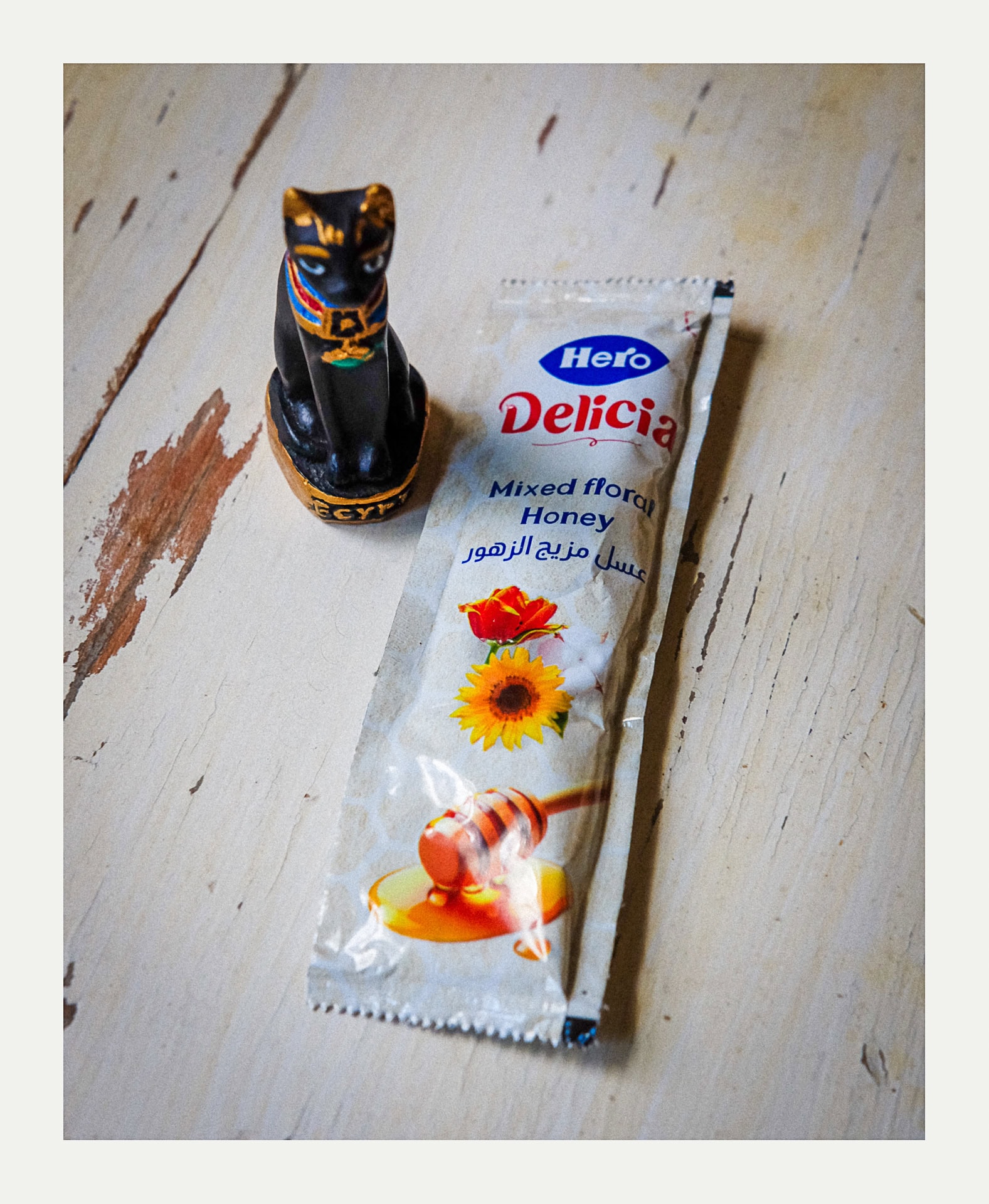 I brought back this tiny packet of honey from our trip to Egypt and tried it in my yogurt today. The flavor was really mild, which surprised me. It was a fun little souvenir to taste, but I still prefer good old American honey. To be fair, this packet probably is not top tier Egyptian honey!