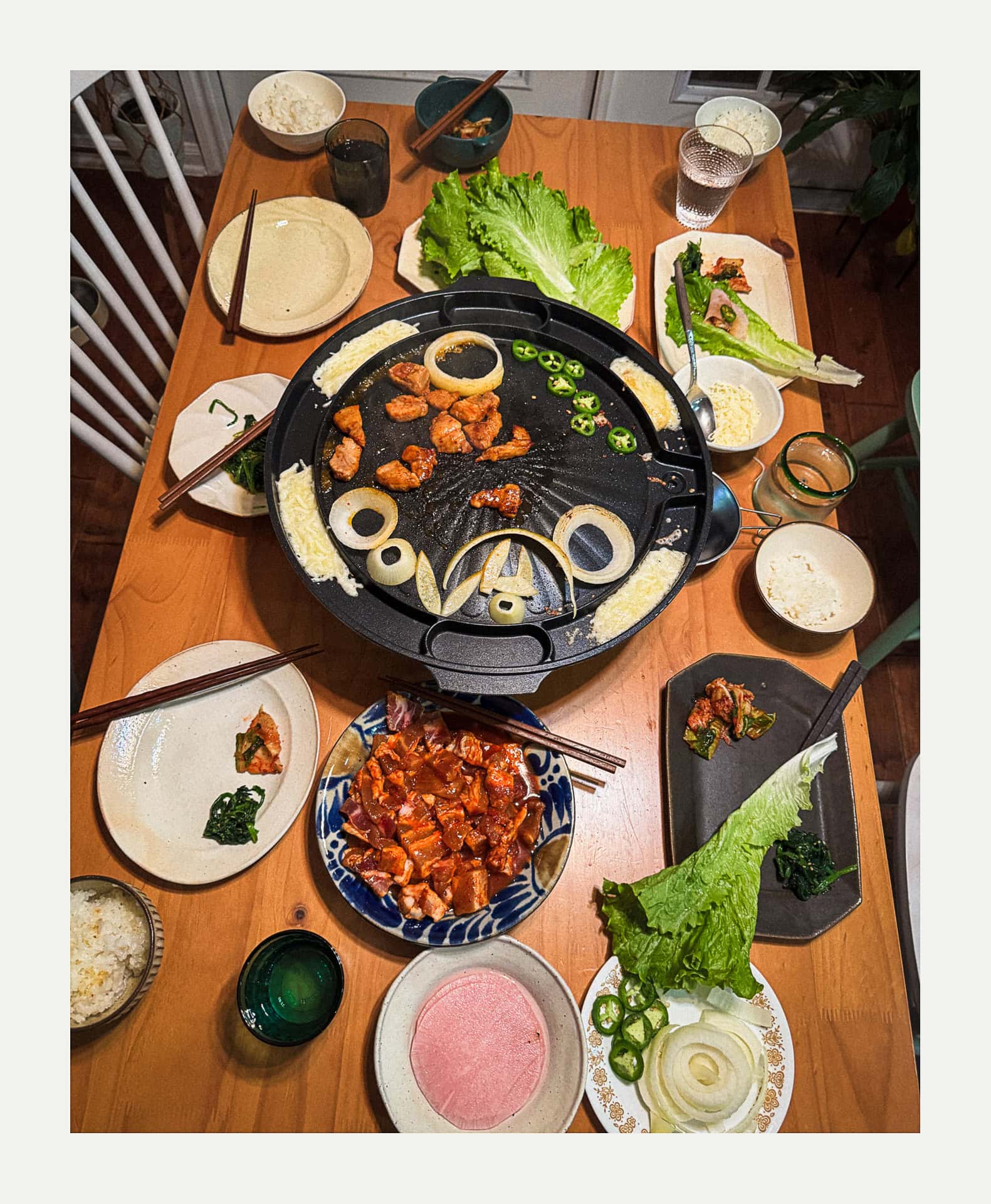 Tonight’s dinner was simple, but it felt special. Korean BBQ at home always does that. We grilled some marinated spicy pork from H-Mart and paired it with kimchi, spinach, lettuce, onion, jalapeño, cheese, and rice. Easy, interactive, and so satisfying.